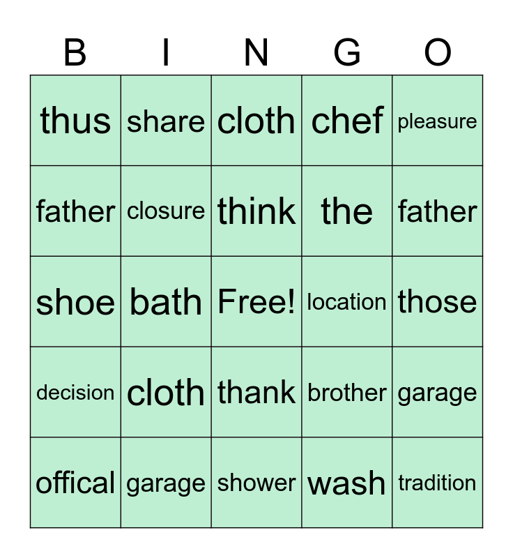This bingo card has a free space and 24 words: cloth, garage, think, offical, pleasure, thus, father, share, location, thank, the, shoe, brother, garage, closure, wash, those, cloth, father, bath, tradition, decision, chef and shower.