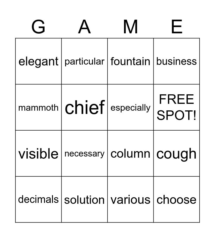 This bingo card has 16 words: solution, cough, fountain, elegant, visible, particular, column, various, mammoth, chief, decimals, business, necessary, FREE SPOT!, especially and choose.