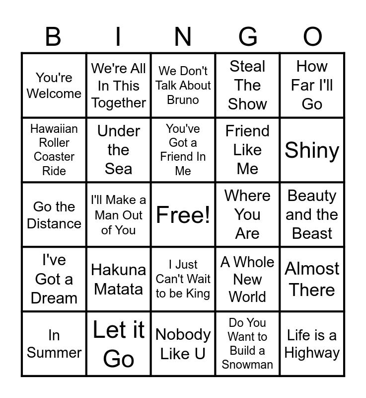 This bingo card has a free space and 29 words: Into the Unknown, Let it Go, We Don't Talk About Bruno, Love is an Open Door, How Far I'll Go, You're Welcome, Under the Sea, You've Got a Friend In Me, Where You Are, Almost There, In Summer, I'll Make a Man Out of You, Do You Want to Build a Snowman, Life is a Highway, Go the Distance, Show Yourself, Nobody Like U, A Whole New World, Shiny, I've Got a Dream, Hakuna Matata, Surface Pressure, Friend Like Me, Beauty and the Beast, Hawaiian Roller Coaster Ride, We're All In This Together, I Just Can't Wait to be King, Steal The Show and Circle of Life.