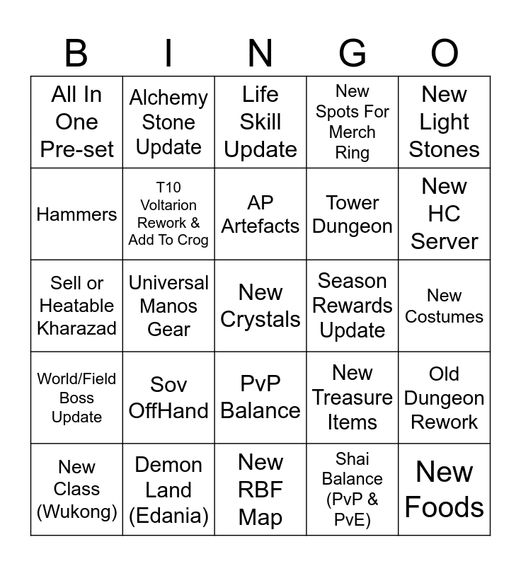 This bingo card has a free space and 24 words: Sov OffHand, Demon Land (Edania), AP Artefacts, New Class (Wukong), New Light Stones, All In One Pre-set, Hammers, Alchemy Stone Update, Season Rewards Update, PvP Balance, Tower Dungeon, Sell or Heatable Kharazad, New Treasure Items, Old Dungeon Rework, T10 Voltarion Rework & Add To Crog, Shai Balance (PvP & PvE), New Costumes, Life Skill Update, New HC Server, Universal Manos Gear, New Foods, World/Field Boss Update, New Spots For Merch Ring and New RBF Map.