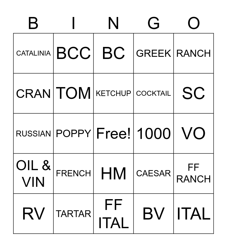 This bingo card has a free space and 24 words: FRENCH, TARTAR, KETCHUP, RV, RANCH, CATALINIA, CRAN, BCC, 1000, HM, COCKTAIL, RUSSIAN, CAESAR, FF RANCH, TOM, BV, VO, BC, SC, POPPY, ITAL, OIL & VIN, GREEK and FF ITAL.
