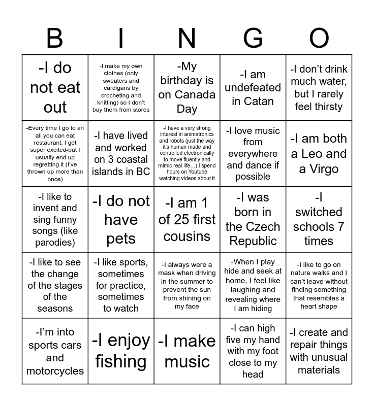 This bingo card has 67 words: -I am friends with the spiders that live in my car, -I’ve been bungee jumping, -I cold dip in the ocean at least twice every winter, -I like to go on nature walks and I can’t leave without finding something that resembles a heart shape, -I do a popcorn reading party where I invite over my friends and we each bring 3 children’s books to share and read to each other and we eat popcorn like we’re watching a movie, -My current hobbies are learning about plant behavior and learning elementary math, -I make my own clothes (only sweaters and cardigans by crocheting and knitting) so I don’t buy them from stores, -I have to eat one banana every day in the morning; however I don’t eat them normally. Since they are a tri-segmented fruit, I separate it in its 3 sections and eat it that way, -I have a very strong interest in animatronics and robots (just the way it’s human made and controlled electronically to move fluently and mimic real life…) I spend hours on Youtube watching videos about it, -Whenever I hear new English words and sentences, I practice them by talking to myself, -I always were a mask when driving in the summer to prevent the sun from shining on my face, -I enjoy watching speeches from all walks of life and listening to them share positive aspects, -I switched schools 7 times, -I don’t drink much water, but I rarely feel thirsty, -I’m not a brave person, yet somehow I can still handle zip-lining, -Every time I go to an all you can eat restaurant, I get super excited-but I usually end up regretting it (I’ve thrown up more than once), -I do not have pets, -I do not eat out, -I live alone, -I love music from everywhere and dance if possible, -I like sports, sometimes for practice, sometimes to watch, -I like to see the change of the stages of the seasons, -I am undefeated in Catan, -I can high five my hand with my foot close to my head, -I can do the rainbow with a soccer ball, -Mexico is my favorite vacation destination, -I love all kinds of potato chips, -I’m scared of spiders, -I am both a Leo and a Virgo, -I switched schools 7 times, -I am 1 of 25 first cousins, -I was a dancer for 10 years (tap, jazz and acro), -I come from an Italian background, -My closest cousin and I were both diagnosed with celiac a month apart, -I do minimal body tattoos, -I’m into sports cars and motorcycles, -Sometimes I eat pizza with ketchup, -When I play hide and seek at home, I feel like laughing and revealing where I am hiding, -I like to invent and sing funny songs (like parodies), -I create and repair things with unusual materials, -I was a competitive swimmer for 10 years, -I have lived and worked on 3 coastal islands in BC, -I was born in the Czech Republic, -I grew up on a small local island, -I’m a captain’s daughter, -I have a degree in fashion marketing, -I want to travel to Scotland, -I enjoy fishing, -I am terrible at remembering song lyrics, -I can bend all my distal interphalangeal joints (joints closest to my finger tips) at once, -My birthday is on Canada Day, -I have a bachelors degree in Human Resources Management, -I won best director in high school, -Crows are really mean to me, -I was featured in the newspaper at 4 years old, -I make music, -I’m terrified of spiders, -I’m obsessed with fashion, -I love going off-roading in the mountains, -I’m obsessed with the Winners store, -I love visiting farmers markets, -I like watching hockey, -I like reading, -I can remember lyrics to songs (especially 80’s songs), -I like to dance, -I like to sing karaoke and -I like to act silly sometimes.