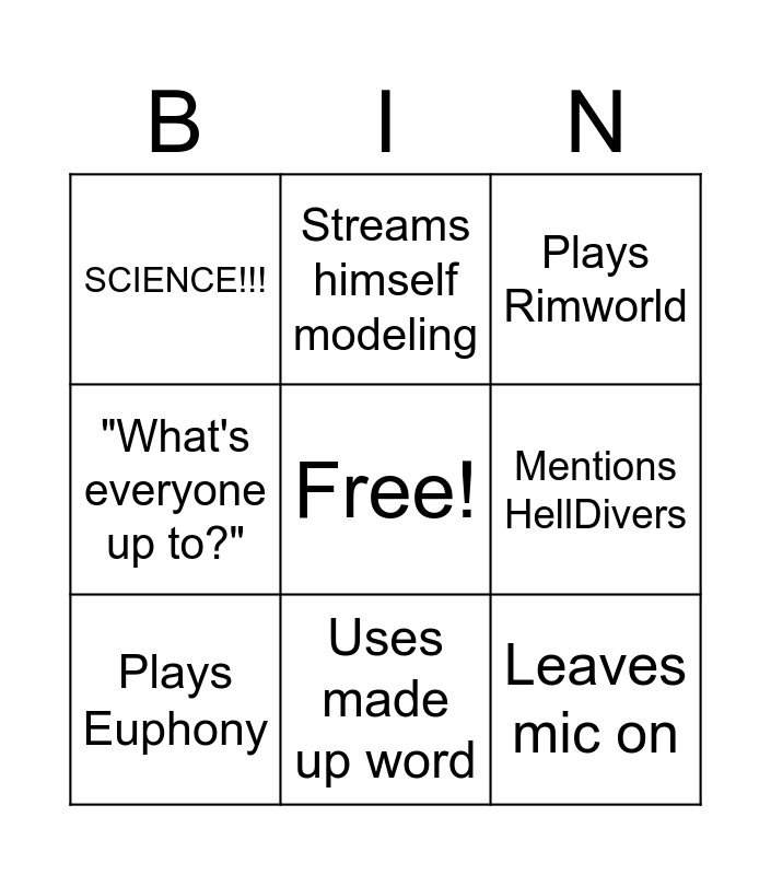This bingo card has a free space and 8 words: Mentions HellDivers, Plays Rimworld, Streams himself modeling, Plays Euphony, SCIENCE!!!, Leaves mic on, "What's everyone up to?" and Uses made up word.