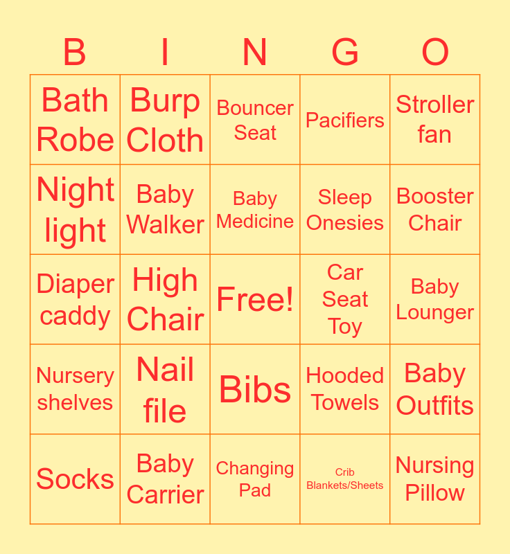 This bingo card has a free space and 30 words: Baby Carrier, Diaper Bag, High Chair, Play Mat, Bath Robe, Bouncer Seat, Baby Walker, Bibs, Car Seat Toy, Changing Pad, Baby Lounger, Nursing Pillow, Crib Blankets/Sheets, Baby Bottles, Booster Chair, Bath Chair, Hooded Towels, Nursery shelves, Nail file, Stroller fan, Diaper caddy, Diaper Cream, Burp Cloth, Sleep Onesies, Night light, Pacifiers, Baby Outfits, Socks, Baby Medicine and Baby Storage Cart.