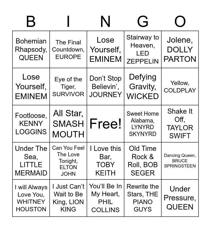 This bingo card has a free space and 81 words: Bohemian Rhapsody, QUEEN, Billie Jean, MICHAEL JACKSON, Lose Yourself, EMINEM, Friends in Low Places, GARTH BROOKS, Can You Feel The Love Tonight, ELTON JOHN, Hey Jude, BEATLES, Shake It Off, TAYLOR SWIFT, Humble, KENDRICK LAMAR, Jolene, DOLLY PARTON, Footloose, KENNY LOGGINS, Don’t Stop Believin’, JOURNEY, Eye of the Tiger, SURVIVOR, Stairway to Heaven, LED ZEPPELIN, Bohemian Rhapsody, QUEEN, Billie Jean, MICHAEL JACKSON, Lose Yourself, EMINEM, Friends in Low Places, GARTH BROOKS, Can You Feel The Love Tonight, ELTON JOHN, Hey Jude, BEATLES, Shake It Off, TAYLOR SWIFT, Humble, KENDRICK LAMAR, Jolene, DOLLY PARTON, Footloose, KENNY LOGGINS, Don’t Stop Believin’, JOURNEY, Eye of the Tiger, SURVIVOR, Stairway to Heaven, LED ZEPPELIN, Rolling in the Deep, ADELE, Sunflower, POST MALONE, Sweet Caroline, NEIL DIAMOND, Shallow, LADY GAGA, Yellow, COLDPLAY, Ring of Fire, JOHNNY CASH, You’ll Be In My Heart, PHIL COLLINS, Take Me Home, Country Roads, JOHN DENVER, I will Always Love You, WHITNEY HOUSTON, Sweet Home Alabama, LYNYRD SKYNYRD, Smells Like Teen Spirit, NIRVANA, Single Ladies, THE CHIPETTES, Kryptonite, 3 DOORS DOWN, Thunderstruck, AC/DC, Under Pressure, QUEEN, We Didn’t Start The Fire, BILLY JOEL, Party in the USA, MILEY CYRUS, Ice Ice Baby, VANILLA ICE, All Star, SMASH MOUTH, Fast Car, TRACY CHAPMAN, The Final Countdown, EUROPE, Before He Cheats, CARRIE UNDERWOOD, Dream On, AEROSMITH, Livin’ On a Prayer, BON JOVI, Old Time Rock & Roll, BOB SEGER, Dancing Queen, BRUCE SPRINGSTEEN, Hey Ya!, OUTKAST, Black Betty, RAM JAM, Shut Up and Dance, WALK THE MOON, Take on Me, A-HA, Pink Pony Club, CHAPPELL ROAN, Bad Blood, TAYLOR SWIFT, I Knew You Were Trouble, TAYLOR SWIFT, A Bar Song, SHABOOZEY, I Love this Bar, TOBY KEITH, I am Not Okay, JELLY ROLL, I wanna Dance with Somebody, WHITNEY HOUSTON, Drunk and I Don’t Wanna Go Home, ELLE KING, Bye Bye Bye, NSYNC, I Want it that Way, BACKSTREET BOYS, Timber, PITBULL, Whiskey Glasses, MORGAN WALLEN, Roar, KATY PERRY, She Had Me at Heads Carolina, COLE SWINDELL, Let It Go, FROZEN, Under The Sea, LITTLE MERMAID, I Just Can’t Wait to Be King, LION KING, You’ve Got a Friend in Me, TOY STORY, Be Our Guest, BEAUTY AND THE BEAST, Fur Elise, LUDWIG VAN BEETHOVEN, Twinkle Lullaby, THE PIANO GUYS, Rewrite the Stars, THE PIANO GUYS, A Thousand Years, THE PIANO GUYS, Defying Gravity, WICKED and The Phantom of the Opera, THE PHANTOM OF THE OPERA.