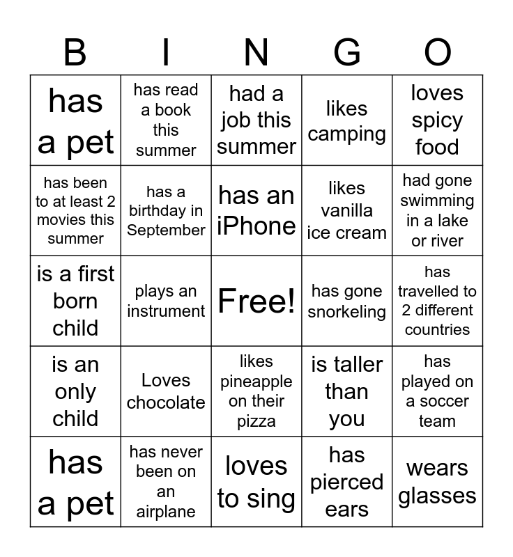 This bingo card has a free space and 24 words: Loves chocolate, has never been on an airplane, has an iPhone, has a pet, loves spicy food, has a pet, has been to at least 2 movies this summer, has read a book this summer, has gone snorkeling, likes pineapple on their pizza, likes vanilla ice cream, is a first born child, is taller than you, has played on a soccer team, has a birthday in September, has pierced ears, has travelled to 2 different countries, had a job this summer, had gone swimming in a lake or river, plays an instrument, wears glasses, is an only child, likes camping and loves to sing.