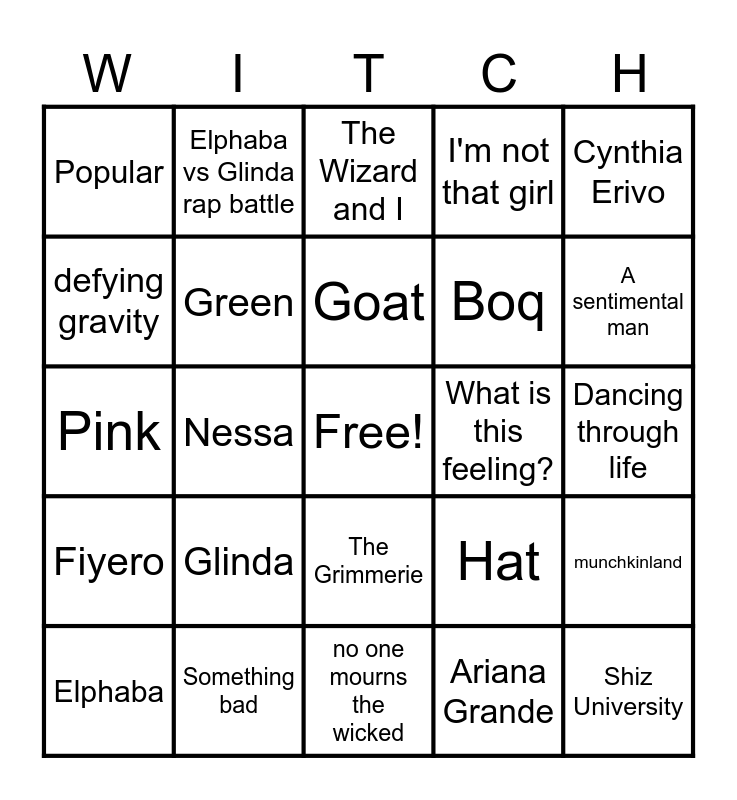 This bingo card has a free space and 24 words: Elphaba, Glinda, Goat, Ariana Grande, Cynthia Erivo, Popular, Elphaba vs Glinda rap battle, The Wizard and I, What is this feeling?, Dancing through life, Pink, Green, Hat, munchkinland, defying gravity, Something bad, no one mourns the wicked, I'm not that girl, A sentimental man, Fiyero, Nessa, The Grimmerie, Boq and Shiz University.