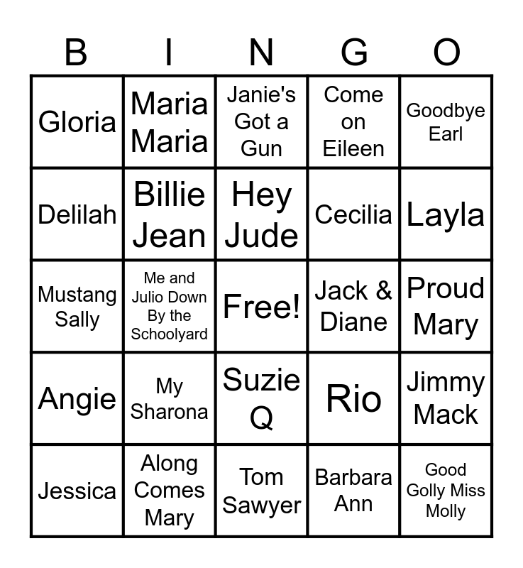 This bingo card has a free space and 60 words: Bad, Bad Leroy Brown, Along Comes Mary, Amanda, Angie, Barbara Ann, Bernadette, Billie Jean, Brandy (You're a Fine Girl), Cecilia, Charlie Brown, Come on Eileen, Cotton Eye Joe, Delilah, Eleanor Rigby, Elvira, Gloria, Good Golly Miss Molly, Goodbye Earl, Help Me, Rhonda, Hey Jude, Jack & Diane, Janie's Got a Gun, Jessica, Jimmy Mack, Johnny B. Goode, Jolene, Jumpin' Jack Flash, Lay Down Sally, Layla, Lola, Louie Louie, Love Grows (Where my Rosemary Goes), Lucy in the Sky with Diamonds, Maggie May, Maria Maria, Mary Jane's Last Dance, Me and Bobby McGee, Me and Julio Down By the Schoolyard, Mrs. Robinson, Mustang Sally, My Maria, My Sharona, Proud Mary, Rhiannon, Rio, Rosanna, Roxanne, Runaround Sue, Sara Smile, Suzie Q, Tom Sawyer, Valleri, Wake up Little Susie, Wendy, Windy, You Can Call Me Al, Peggy Sue, Oh Sherrie, Jessie's Girl and Arthur's Theme (Best That You Can Do).