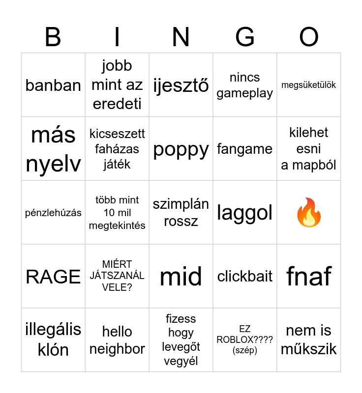 This bingo card has a free space and 24 words: illegális klón, MIÉRT JÁTSZANÁL VELE?, poppy, EZ ROBLOX???? (szép), megsüketülök, banban, jobb mint az eredeti, ijesztő, laggol, 🔥, pénzlehúzás, kicseszett faházas játék, clickbait, fnaf, más nyelv, hello neighbor, fizess hogy levegőt vegyél, nincs gameplay, kilehet esni a mapból, RAGE, több mint 10 mil megtekintés, mid, fangame and nem is műkszik.