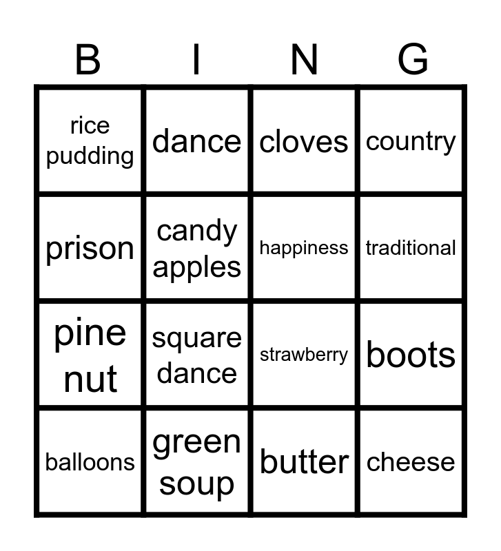 This bingo card has 46 words: Free!, balloons, corn, bonfire, flags, checkered, dance, straw hat, candy apples, popcorn, happiness, country, farmer, accordion, cotton candy, colorful, traditional, green soup, fishing game, prison, boots, pig tails, rice pudding, pine nut, decorations, square dance, games, firework, milk, cheese, coconut, sugar cane, cornmeal, ring toss, food stand, corn on the cob, butter, hot dog, soda, mulled wine, cinnamon, cloves, strawberry, peanut, chocolate and music.