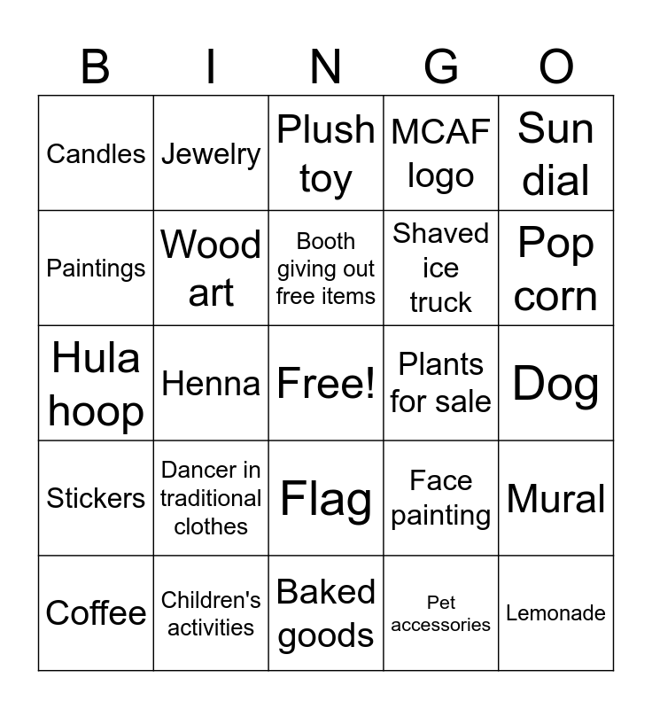 This bingo card has a free space and 24 words: Dancer in traditional clothes, Children's activities, Booth giving out free items, Coffee, Sun dial, Candles, Paintings, Jewelry, Plants for sale, Flag, Shaved ice truck, Hula hoop, Face painting, Mural, Wood art, Pet accessories, Dog, Plush toy, Pop corn, Henna, Lemonade, Stickers, MCAF logo and Baked goods.