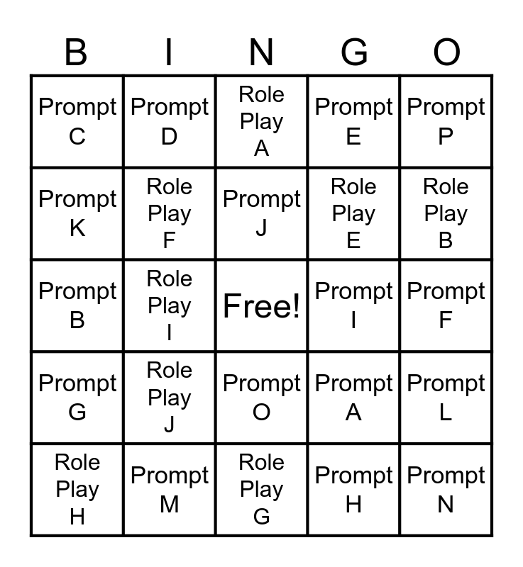 This bingo card has a free space and 27 words: Prompt A, Role Play C, Role Play E, Role Play G, Prompt K, Role Play A, Prompt D, Prompt G, Prompt I, Prompt L, Prompt B, Prompt E, Role Play H, Prompt M, Role Play B, Role Play D, Role Play F, Prompt J, Role Play J, Prompt C, Prompt F, Prompt H, Role Play I, Prompt N, Prompt O, Prompt P and Role Play K.