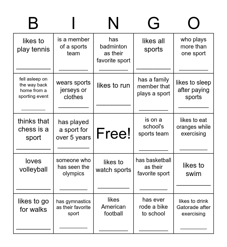 This bingo card has a free space and 24 words: someone who has seen the olympics _________, has gymnastics as their favorite sport __________, likes to run _________, likes to go for walks _________, who plays more than one sport _________, likes to play tennis _________, fell asleep on the way back home from a sporting event _________, is a member of a sports team _________, is on a school's sports team _________, likes to watch sports _________, has a family member that plays a sport _________, thinks that chess is a sport _________, has basketball as their favorite sport _________, likes to swim _________, wears sports jerseys or clothes _________, has ever rode a bike to school _________, likes to eat oranges while exercising _________, has badminton as their favorite sport _________, likes to sleep after paying sports _________, has played a sport for over 5 years _________, likes to drink Gatorade after exercising _________, loves volleyball _________, likes all sports _________ and likes American football _________.