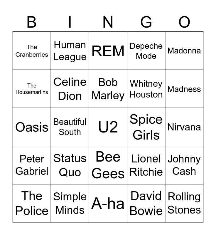 This bingo card has 45 words: Queen, U2, Abba, The Police, Fatboy Slim, David Bowie, REM, Kate Bush, Madonna, Simple Minds, Depeche Mode, Spice Girls, Bee Gees, Status Quo, Boyzone, A-ha, Wham, Oasis, Rick Astley, Madness, Human League, Soft Cell, Blondie, The Cranberries, Dexys Midnight Runners, Nirvana, Foo Fighters, Bruce Springsteen, Lionel Ritchie, Peter Gabriel, Genesis, Johnny Cash, Boomtown Rats, Van Morrison, UB40, Beautiful South, The Pogues, Backstreet Boys, Rolling Stones, Bob Marley, The Housemartins, Whitney Houston, Tina Turner, Celine Dion and The Undertones.