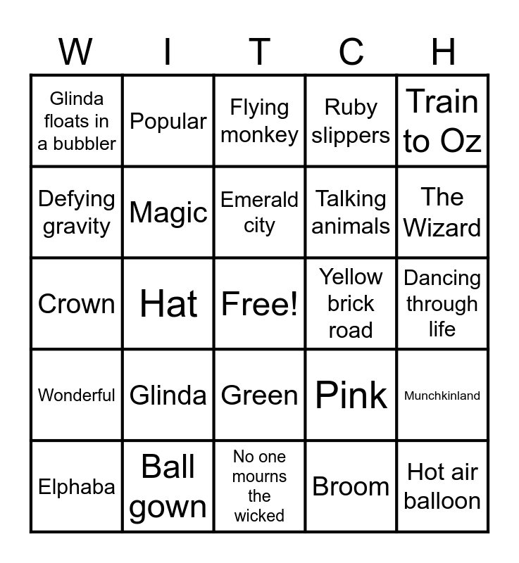 This bingo card has a free space and 24 words: Elphaba, Glinda, Emerald city, Broom, Train to Oz, Glinda floats in a bubbler, Popular, Flying monkey, Yellow brick road, Dancing through life, Crown, Magic, Pink, Munchkinland, Defying gravity, Ball gown, No one mourns the wicked, Ruby slippers, The Wizard, Wonderful, Hat, Green, Talking animals and Hot air balloon.