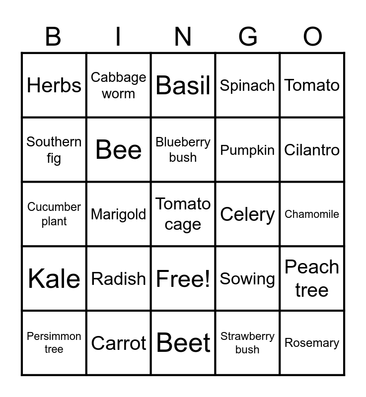 This bingo card has 26 words: Free!, Strawberry bush, Blueberry bush, Carrot, Tomato, Herbs, Southern fig, Cabbage worm, Chamomile, Sowing, Pumpkin, Cucumber plant, Peach tree, Persimmon tree, Marigold, Peas, Spinach, Kale, Basil, Tomato cage, Cilantro, Beet, Celery, Radish, Bee and Rosemary.
