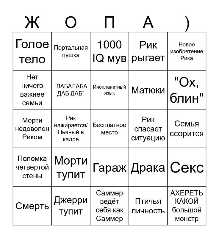 This bingo card has a free space and 24 words: Морти тупит, Джерри тупит, Инопланетный язык, Смерть, Новое изобретение Рика, Голое тело, Нет ничего важнее семьи, Портальная пушка, Рик спасает ситуацию, Гараж, Матюки, Морти недоволен Риком, Драка, Секс, "ВАБАЛАБА ДАБ ДАБ", Птичья личность, Семья ссорится, 1000 IQ мув, "Ох, блин", Рик нажирается/Пьяный в кадре, АХЕРЕТЬ КАКОЙ большой монстр, Поломка четвертой стены, Рик рыгает and Саммер ведёт себя как Саммер.
