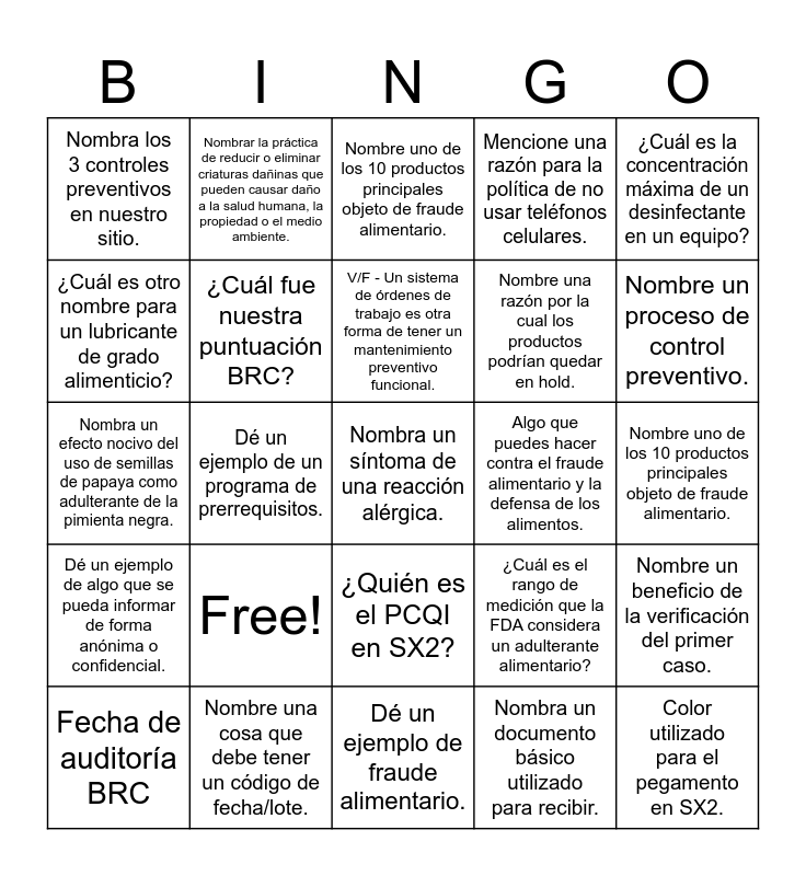 This bingo card has 25 words: Free!, Dé un ejemplo de fraude alimentario., V/F - Un sistema de órdenes de trabajo es otra forma de tener un mantenimiento preventivo funcional., Fecha de auditoría BRC, ¿Cuál es la concentración máxima de un desinfectante en un equipo?, Nombra los 3 controles preventivos en nuestro sitio., ¿Cuál es otro nombre para un lubricante de grado alimenticio?, Nombrar la práctica de reducir o eliminar criaturas dañinas que pueden causar daño a la salud humana, la propiedad o el medio ambiente., Algo que puedes hacer contra el fraude alimentario y la defensa de los alimentos., ¿Quién es el PCQI en SX2?, Nombre una razón por la cual los productos podrían quedar en hold., Nombra un efecto nocivo del uso de semillas de papaya como adulterante de la pimienta negra., ¿Cuál es el rango de medición que la FDA considera un adulterante alimentario?, Nombre un beneficio de la verificación del primer caso., ¿Cuál fue nuestra puntuación BRC?, Color utilizado para el pegamento en SX2., Nombre uno de los 10 productos principales objeto de fraude alimentario., Nombre uno de los 10 productos principales objeto de fraude alimentario., Nombre un proceso de control preventivo., Dé un ejemplo de un programa de prerrequisitos., Nombra un síntoma de una reacción alérgica., Nombre una cosa que debe tener un código de fecha/lote., Dé un ejemplo de algo que se pueda informar de forma anónima o confidencial., Mencione una razón para la política de no usar teléfonos celulares. and Nombra un documento básico utilizado para recibir..