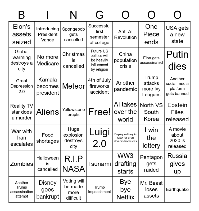 This bingo card has a free space and 48 words: WW3 drafting starts, Elon gets assassinated, Trump Impeachment, Aliens, Meteor, Epstein Files released, Introducing President Vance, Disney goes bankrupt, One Piece ends, Luigi 2.0, USA gets a new state, Successful first semester of college, Trump attacks more Ivy Leagues, Another pandemic, Zombies, North VS South Korea, Global warming destroys a city, Putin dies, Pentagon gets raided, Anti-AI Revolution, China population crisis, Yellowstone erupts, Elon's assets seized, No more Medicare, Russia gives up, Christmas is cancelled, Another social media platform gets banned, Another Trump assassination attempt, 4th of July fireworks accident, Kamala becomes president, Mr. Beast loses assets, AI takes over the world, A movie about 2020 is released, Halloween is cancelled, Reality TV star does a murder, Deploy military in USA for drug dealers/homeless, I win the lottery, Great Depression 2.0, Huge explosion destroys city, R.I.P NASA, War with Iran escalates, Earthquake, Spongebob gets cancelled, Voting will be made more difficult, Future US politics will be heavily influenced by religion, Tsunami, Food shortages and Bye bye Netflix.