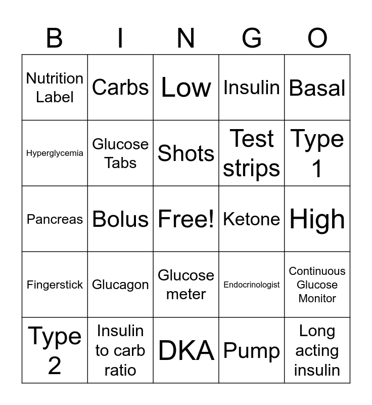 This bingo card has a free space and 24 words: Type 2, Glucagon, Shots, Pump, Basal, Nutrition Label, Carbs, Low, Ketone, High, Pancreas, Glucose Tabs, Endocrinologist, Continuous Glucose Monitor, Hyperglycemia, Insulin to carb ratio, DKA, Insulin, Type 1, Fingerstick, Bolus, Glucose meter, Test strips and Long acting insulin.