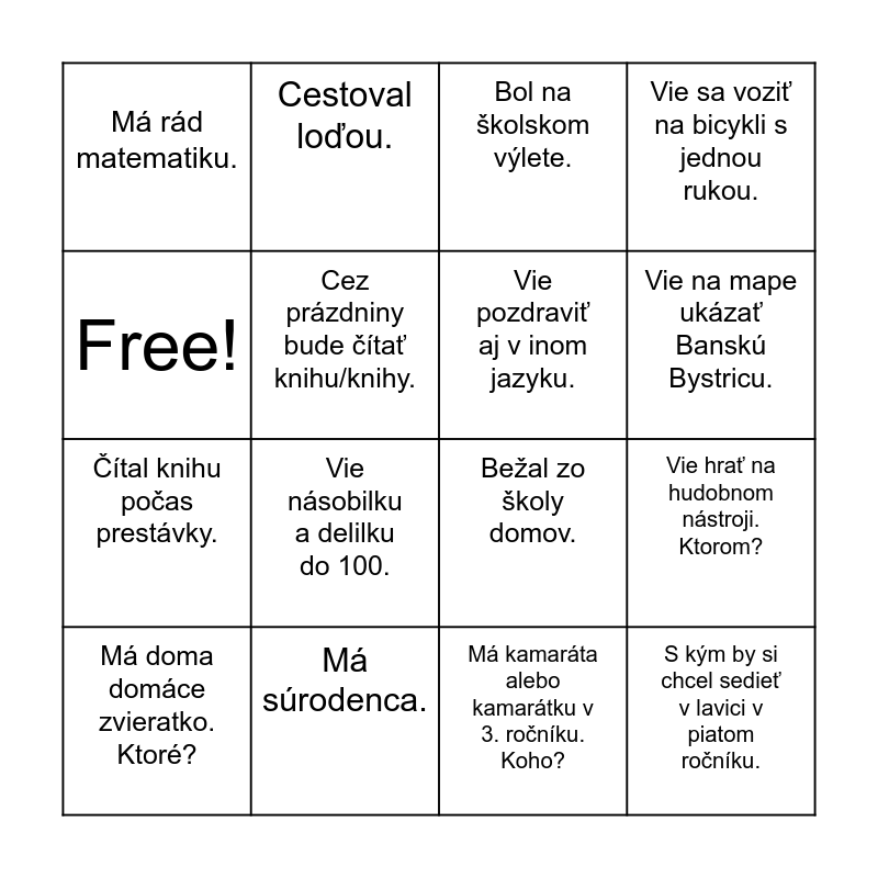 This bingo card has 16 words: Má súrodenca., Vie hrať na hudobnom nástroji. Ktorom?, Bol na školskom výlete., Má rád matematiku., Čítal knihu počas prestávky., Cestoval loďou., Bežal zo školy domov., Má kamaráta alebo kamarátku v 3. ročníku. Koho?, Free!, Cez prázdniny bude čítať knihu/knihy., Má doma domáce zvieratko. Ktoré?, Vie sa voziť na bicykli s jednou rukou., Vie násobilku a delilku do 100., Vie na mape ukázať Banskú Bystricu., Vie pozdraviť aj v inom jazyku. and S kým by si chcel sedieť v lavici v piatom ročníku..
