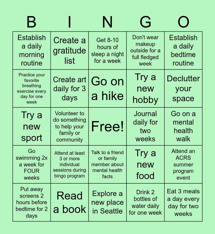 This bingo card has a free space and 24 words: Attend at least 3 or more individual sessions during bingo program, Read a book, Go on a hike, Put away screens 2 hours before bedtime for 2 days, Establish a daily bedtime routine, Establish a daily morning routine, Practice your favorite breathing exercise every day for one week, Create a gratitude list, Journal daily for two weeks, Talk to a friend or family member about mental health facts, Try a new hobby, Try a new sport, Try a new food, Attend an ACRS summer program event, Create art daily for 3 days, Drink 2 bottles of water daily for one week, Go on a mental health walk, Get 8-10 hours of sleep a night for a week, Declutter your space, Volunteer to do something to help your family or community, Eat 3 meals a day every day for two weeks, Go swimming 2x a week for FOUR weeks, Don't wear makeup outside for a full fledged week and Explore a new place in Seattle.