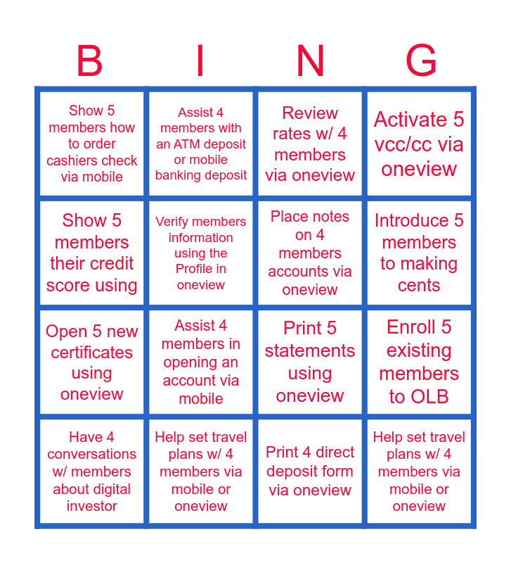 This bingo card has 16 words: Help set travel plans w/ 4 members via mobile or oneview, Enroll 5 existing members to OLB, Review rates w/ 4 members via oneview, Show 5 members how to order cashiers check via mobile, Open 5 new certificates using oneview, Assist 4 members with an ATM deposit or mobile banking deposit, Print 5 statements using oneview, Print 4 direct deposit form via oneview, Show 5 members their credit score using, Verify members information using the Profile in oneview, Have 4 conversations w/ members about digital investor, Activate 5 vcc/cc via oneview, Assist 4 members in opening an account via mobile, Introduce 5 members to making cents, Place notes on 4 members accounts via oneview and Help set travel plans w/ 4 members via mobile or oneview.