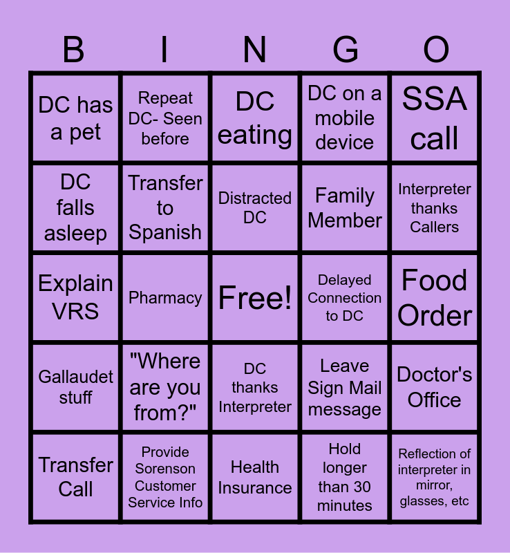 This bingo card has a free space and 24 words: "Where are you from?", Provide Sorenson Customer Service Info, Distracted DC, Transfer Call, SSA call, DC has a pet, DC falls asleep, Repeat DC- Seen before, Delayed Connection to DC, DC thanks Interpreter, Family Member, Explain VRS, Leave Sign Mail message, Doctor's Office, Transfer to Spanish, Hold longer than 30 minutes, Food Order, DC eating, Interpreter thanks Callers, Pharmacy, Reflection of interpreter in mirror, glasses, etc, Gallaudet stuff, DC on a mobile device and Health Insurance.