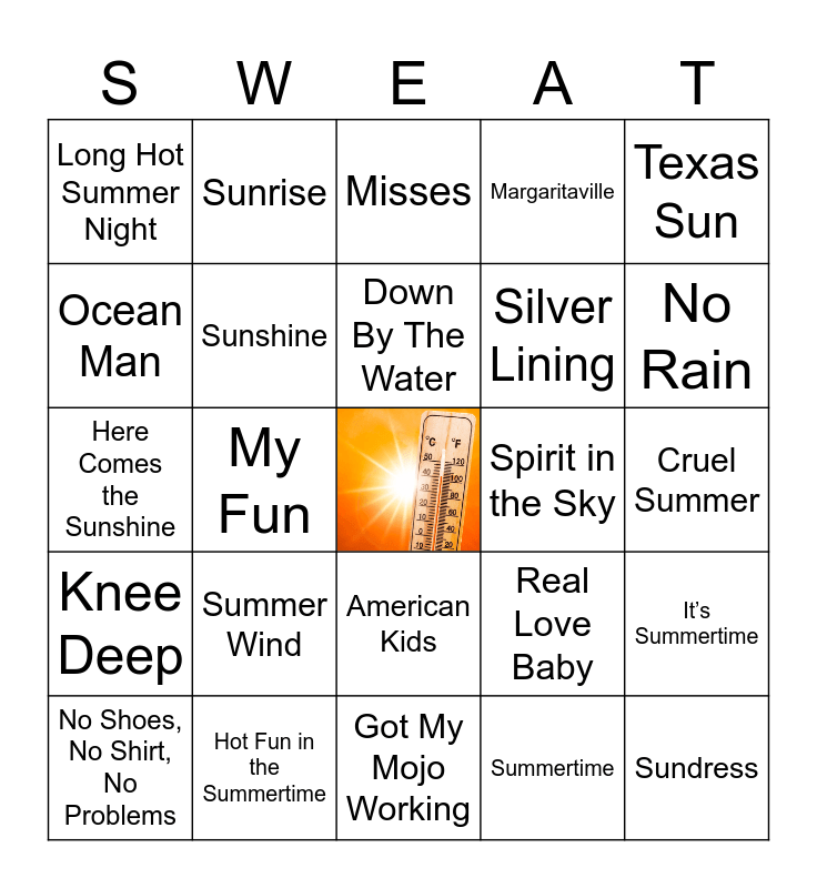This bingo card has a free space and 91 words: All Summer Long, Amber, American Kids, Badfish, Banana Boat (Day-O), Bananas and Blow, Beyond the Sea, Black Hole Sun, Blister in the Sun, The Boys of Summer, Cabin by the Sea, Can’t Stop the Sun, Coconut, Cruel Summer, Doses & Mimosas, Down By The Water, Edge of the Ocean, Endless Summer Nights, Escape (The Pina Colada Song), Feels Like Summer, Fireball, Fun, Fun, Fun, Got My Mojo Working, Hello Sunshine, Here Comes the Sunshine, Hot Fun in the Summertime, I Can See Clearly Now, In The Summertime, Island In the Sun, Island Song, It’s Five O’Clock Somewhere, It’s Summertime, Jamming, Knee Deep, Long Hot Summer Night, Margaritaville, Misses, Mr. Blue Sky, My Fun, No Rain, No Shoes, No Shirt, No Problems, Ocean Man, One Love/People Get Ready, Over the Rainbow, Pocketful of Sunshine, Real Love Baby, Riptide, Rockaway Beach, Santa Monica, Scarlet Begonias, Sedona, Silver Lining, (Sittin’ On) the Dock of the Bay, A Sky Full of Stars, The Sound of Sunshine, Southern Nights, Spirit in the Sky, Steal My Sunshine, Summer, Summer Breeze, Summer Days, Summer in the City, Summer is Over, Summer Love, Summer Night City, Summer Nights (Grease), Summer of ‘69, Summertime, Summertime Blues, Summertime Sadness, Summer Wind, Sundress, Sunny, Sunny Afternoon, Sunrise, Sunshine, Sunshine, Lollipops, and Rainbows, Sunshine of Your Love, Sweat (A La La La La Long), The Sweet Escape, Tequila Sunrise, Texas Sun, The Theme from “A Summer Place), Three Little Birds, The Tide is High, Toes, Walking On A Dream, Walkin’ in the Sun, Watermelon Sugar, West Coast and When the Sun Goes Down.