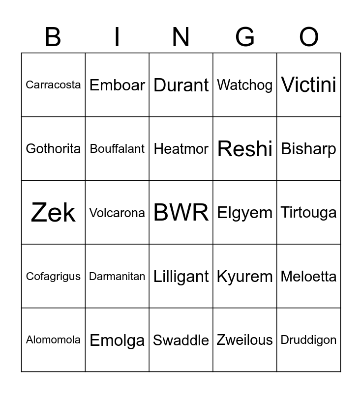 This bingo card has a free space and 24 words: Darmanitan, Emolga, Heatmor, Alomomola, Victini, Carracosta, Gothorita, Emboar, Elgyem, Lilligant, Reshi, Zek, Kyurem, Meloetta, Bouffalant, Zweilous, Tirtouga, Durant, Bisharp, Volcarona, Druddigon, Cofagrigus, Watchog and Swaddle.