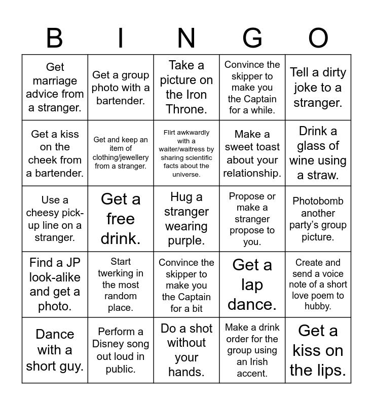 This bingo card has 25 words: Find a JP look-alike and get a photo., Perform a Disney song out loud in public., Hug a stranger wearing purple., Make a drink order for the group using an Irish accent., Tell a dirty joke to a stranger., Get marriage advice from a stranger., Get a group photo with a bartender., Take a picture on the Iron Throne., Propose or make a stranger propose to you., Create and send a voice note of a short love poem to hubby., Get a kiss on the cheek from a bartender., Get and keep an item of clothing/jewellery from a stranger., Do a shot without your hands., Get a lap dance., Drink a glass of wine using a straw., Dance with a short guy., Get a free drink., Flirt awkwardly with a waiter/waitress by sharing scientific facts about the universe., Make a sweet toast about your relationship., Photobomb another party’s group picture., Use a cheesy pick-up line on a stranger., Start twerking in the most random place., Convince the skipper to make you the Captain for a bit, Convince the skipper to make you the Captain for a while. and Get a kiss on the lips..