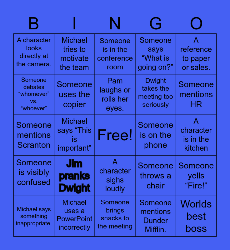 This bingo card has a free space and 24 words: Michael says something inappropriate., Jim pranks Dwight, Pam laughs or rolls her eyes., Someone mentions Dunder Mifflin., A reference to paper or sales., A character looks directly at the camera., Michael tries to motivate the team, Someone is in the conference room, Someone is on the phone, A character is in the kitchen, Someone mentions Scranton, Someone uses the copier, Someone throws a chair, Someone yells “Fire!”, Someone debates “whomever” vs. “whoever”, Michael uses a PowerPoint incorrectly, Someone brings snacks to the meeting, Someone says “What is going on?”, Someone mentions HR, Someone is visibly confused, Michael says “This is important”, A character sighs loudly, Dwight takes the meeting too seriously and Worlds best boss.