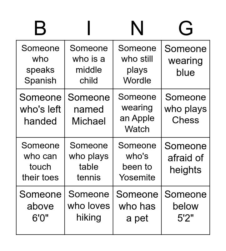 This bingo card has 16 words: Someone above 6'0", Someone who loves hiking, Someone who still plays Wordle, Someone wearing blue, Someone who's left handed, Someone who is a middle child, Someone who's been to Yosemite, Someone afraid of heights, Someone who speaks Spanish, Someone named Michael, Someone who has a pet, Someone who plays Chess, Someone who can touch their toes, Someone who plays table tennis, Someone wearing an Apple Watch and Someone below 5'2".