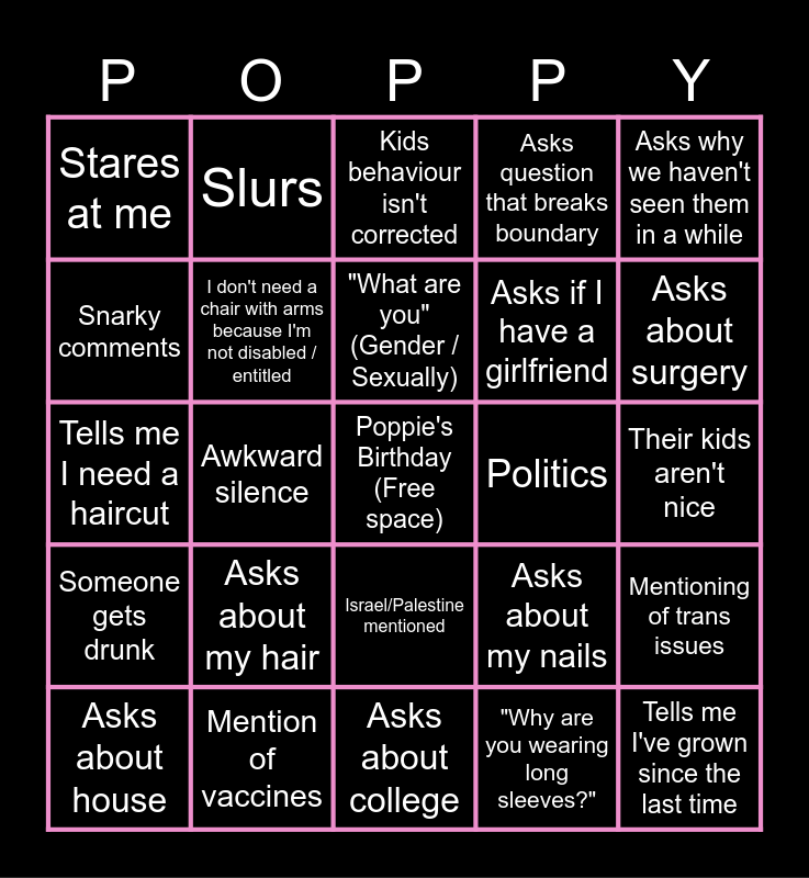 This bingo card has a free space and 24 words: Asks about my hair, Mention of vaccines, "What are you" (Gender / Sexually), Asks about house, Asks why we haven't seen them in a while, Stares at me, Snarky comments, Slurs, Politics, Israel/Palestine mentioned, Asks if I have a girlfriend, Tells me I need a haircut, Asks about my nails, Mentioning of trans issues, I don't need a chair with arms because I'm not disabled / entitled, "Why are you wearing long sleeves?", Their kids aren't nice, Kids behaviour isn't corrected, Asks about surgery, Awkward silence, Tells me I've grown since the last time, Someone gets drunk, Asks question that breaks boundary and Asks about college.