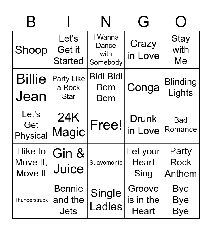 This bingo card has a free space and 24 words: Gin & Juice, Bennie and the Jets, Bidi Bidi Bom Bom, Thunderstruck, Stay with Me, Shoop, Billie Jean, Let's Get it Started, Drunk in Love, Suavemente, Conga, Let's Get Physical, Let your Heart Sing, Party Rock Anthem, Party Like a Rock Star, Groove is in the Heart, Bad Romance, I Wanna Dance with Somebody, Blinding Lights, 24K Magic, Bye Bye Bye, I like to Move It, Move It, Crazy in Love and Single Ladies.