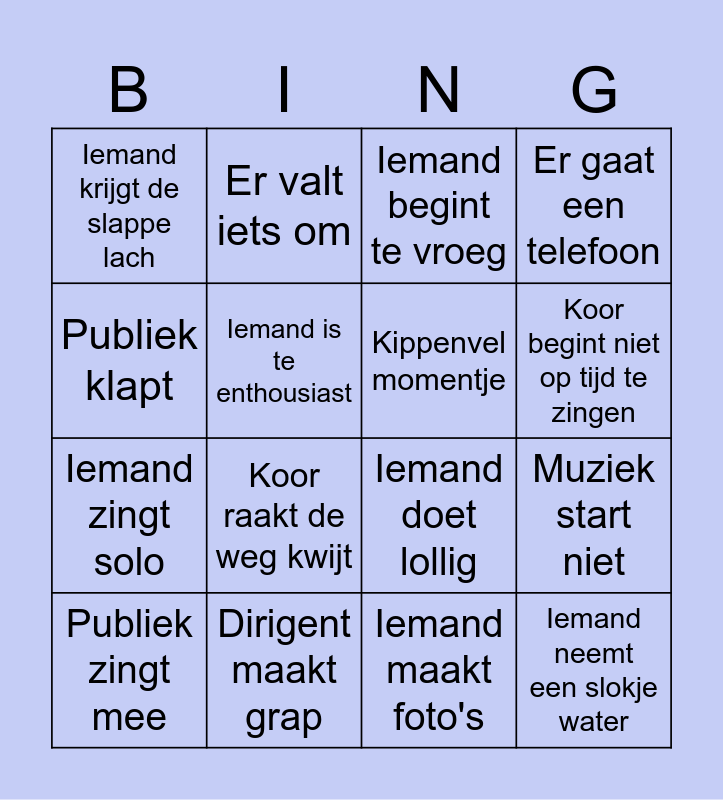 This bingo card has 16 words: Dirigent maakt grap, Muziek start niet, Iemand begint te vroeg, Iemand krijgt de slappe lach, Iemand zingt solo, Er valt iets om, Iemand doet lollig, Iemand maakt foto's, Publiek klapt, Iemand is te enthousiast, Publiek zingt mee, Er gaat een telefoon, Koor raakt de weg kwijt, Koor begint niet op tijd te zingen, Kippenvel momentje and Iemand neemt een slokje water.