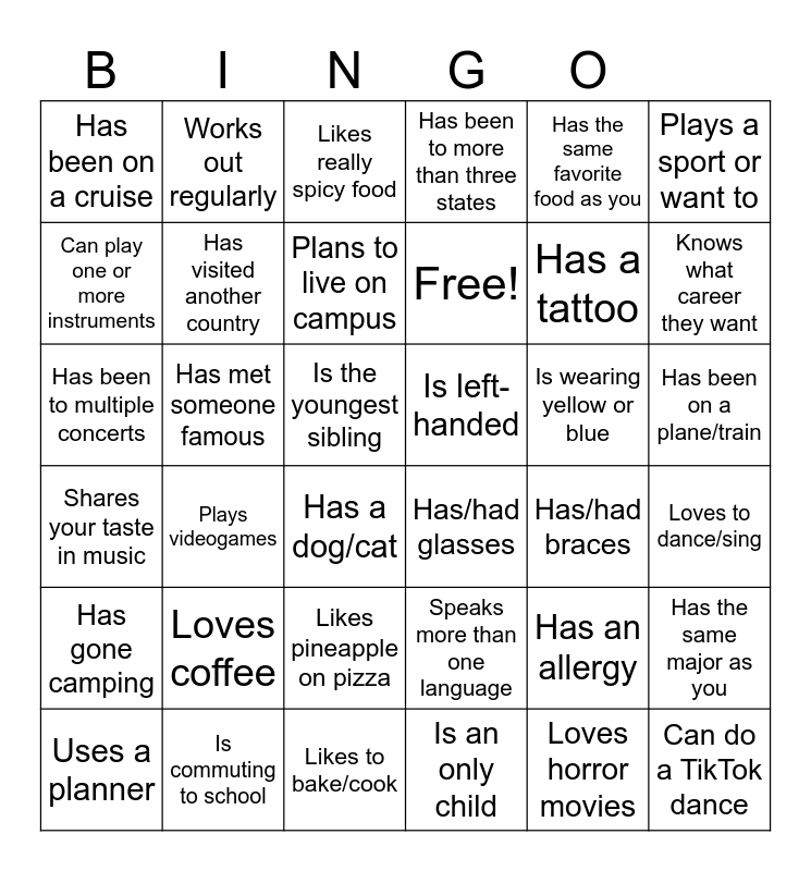 This bingo card has 36 words: Speaks more than one language, Likes pineapple on pizza, Is an only child, Can play one or more instruments, Shares your taste in music, Is left-handed, Has visited another country, Likes to bake/cook, Has the same favorite food as you, Has an allergy, Knows what career they want, Has been to more than three states, Has the same major as you, Has met someone famous, Free!, Has been on a cruise, Has gone camping, Is wearing yellow or blue, Has been to multiple concerts, Likes really spicy food, Is the youngest sibling, Plays videogames, Has/had glasses, Has a dog/cat, Has/had braces, Works out regularly, Has a tattoo, Is commuting to school, Plans to live on campus, Plays a sport or want to, Can do a TikTok dance, Uses a planner, Loves to dance/sing, Has been on a plane/train, Loves coffee and Loves horror movies.