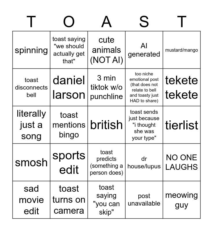 This bingo card has 51 words: toast tangent, british, live performance, toast saying "you can skip", sports edit, post thats on the verge of just flirting, toast saying "we should actually get that", already seen it, toast disconnects bell, toasty manually reloads tiktok time, daniel larson, AI generated, NO ONE LAUGHS, dr house/lupus, toast tells bell not to skip/go back, flashbang, 3 min tiktok w/o punchline, toast sends just because "i thought she was your type", mentally disabled (not british), mustard/mango, toast mentions bingo, post unavailable, spinning, too niche emotional post (that does not relate to bell and toasty just HAD to share), you have to look something up, meowing guy, tekete tekete, young sheldon, sad movie edit, cute animals (NOT AI), actually insightful, WE'RE SO BACK/its joever.../WE'RE SO BACK, bomboclaat, hero thirst trap, toast gremlin laugh, toast turns on camera, 3 tiktoks with the same premise in a row, direct attack on bell, toast does "im just a widdle guy" type thing, just gameplay, tierlist, smosh, toasty moans, toast says "youre obsessed", someone predicts what happens, just loud noise, literally just a song, doom & despair (jeff buckley song), 99+ tiktoks sent, toast predicts (something a person does) and 3 shirtless toast photos.