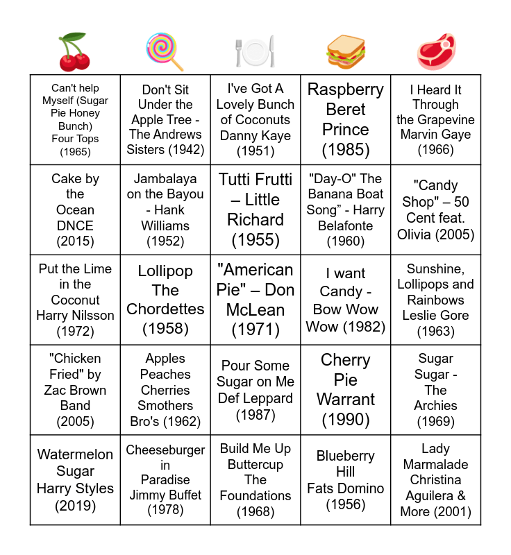 This bingo card has 35 words: Incense & Peppermints - Strawberry Alarm Clock (1967), Bread And Butter - The New beats (1964), Cherry Bomb John Cougar Mellencamp (1987), Jambalaya on the Bayou - Hank Williams (1952), Pour Some Sugar on Me Def Leppard (1987), Raspberry Beret Prince (1985), Cake by the Ocean DNCE (2015), Strawberry Fields Forever The Beatles (1967), Tutti Frutti – Little Richard (1955), Candy Man - Sammy David Jr (1971), Put the Lime in the Coconut Harry Nilsson (1972), I Heard It Through the Grapevine Marvin Gaye (1966), Rock Lobster The B-52's (1979), Brown Sugar The Rolling Stones (1971), Can't help Myself (Sugar Pie Honey Bunch) Four Tops (1965), I want Candy - Bow Wow Wow (1982), Blueberry Hill Fats Domino (1956), Lollipop The Chordettes (1958), "Chicken Fried" by Zac Brown Band (2005), "American Pie" – Don McLean (1971), Cherry Pie Warrant (1990), Watermelon Sugar Harry Styles (2019), Sugar Sugar - The Archies (1969), Cheeseburger in Paradise Jimmy Buffet (1978), I've Got A Lovely Bunch of Coconuts Danny Kaye (1951), "Candy Shop" – 50 Cent feat. Olivia (2005), Lady Marmalade Christina Aguilera & More (2001), Fishin' in the Dark -Nitty Gritty Dirt Band (1987), "Day-O" The Banana Boat Song” - Harry Belafonte (1960), Sunshine, Lollipops and Rainbows Leslie Gore (1963), Green Onions by Booker T & The MG's (1962), Build Me Up Buttercup The Foundations (1968), Apples Peaches Cherries Smothers Bro's (1962), Don't Sit Under the Apple Tree - The Andrews Sisters (1942) and "Peaches"—The Presidents of the United States (1996).