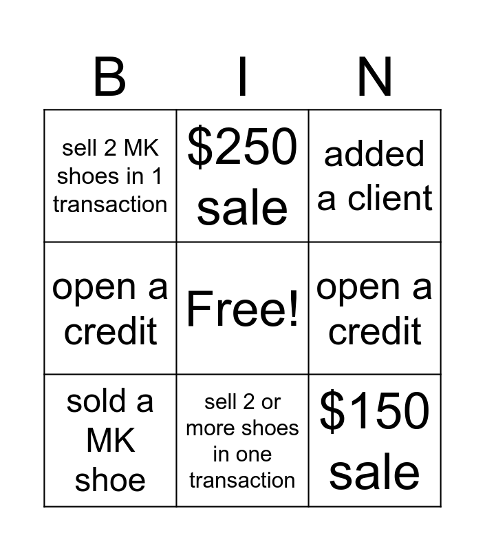 This bingo card has a free space and 8 words: open a credit, added a client, $250 sale, sold a MK shoe, sell 2 MK shoes in 1 transaction, $150 sale, open a credit and sell 2 or more shoes in one transaction.