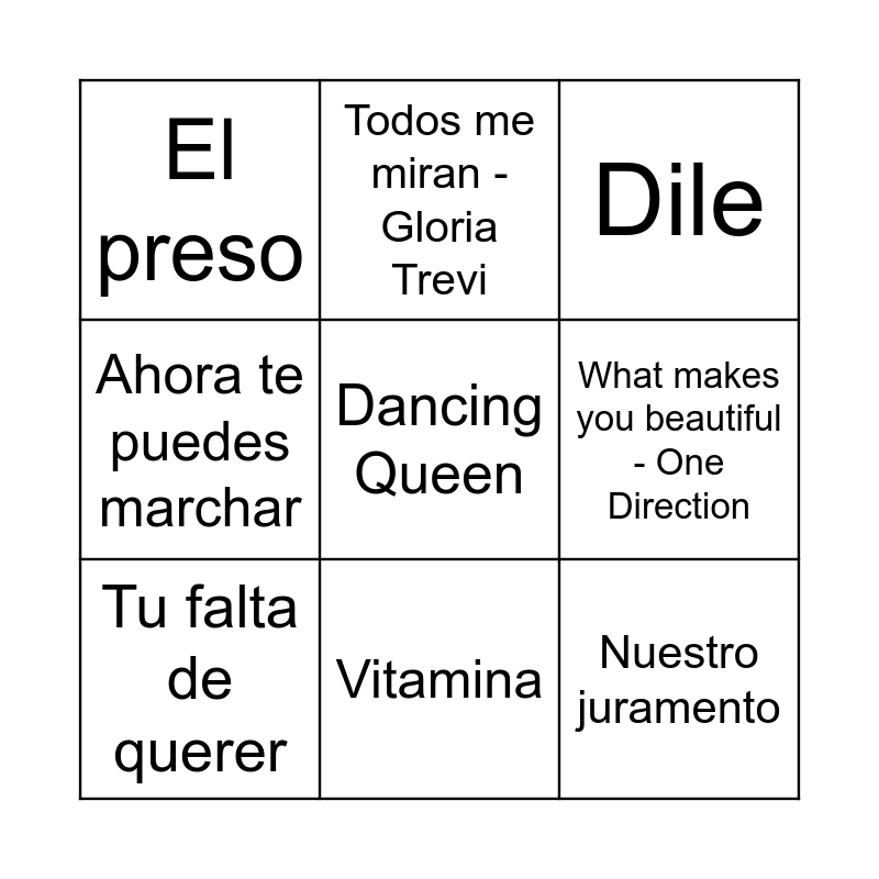 This bingo card has 50 words: Rolling in the deep - Adele, Suerte - Shakira, Alto Troyanaje - Waldokinc, Rosas - La Oreja de Van Gogh, Angel de Luz - Juan Fernando Velasco, Sweet Child O`Mine - Guns N` Roses, Todos me miran - Gloria Trevi, Envolver - Anitta, What makes you beautiful - One Direction, Perfecta, Tu falta de querer, Ahora te puedes marchar, Gata bajo, Devuelveme a mi chica, Flores amarillas, Claridad, Vitamina, Losing my religion, The climb, Dancing Queen, Solo tu, El rey, El preso, Nuestro juramento, Danza Kuduro, Efecto, Tusa, Gasolina, Dile, Mesa que mas aplauda, Suavamente, Oiga, mire, vea, El chulla quiteño, Amapola, Sexy and I know it, Las divinas, Salvame, Como la flor, De musica ligera, We will rock you, Your are the one that I want, Girls just want to have fun, Hey jude, Hips dont lie, Ya te olvide, Mi refe, El sol no regresa, La carta, La tortura and Limon y sal.