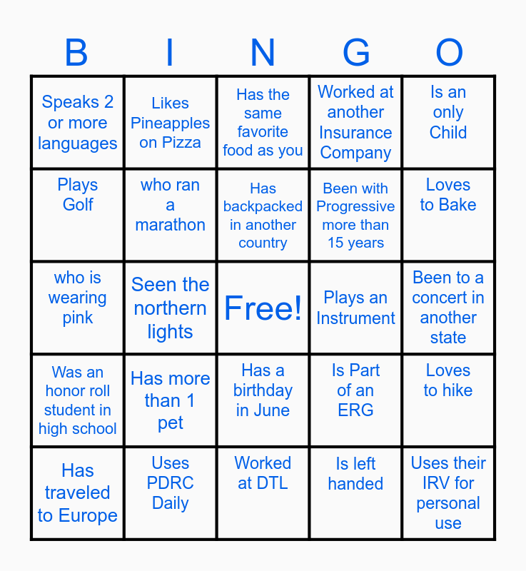 This bingo card has a free space and 24 words: Has traveled to Europe, Has more than 1 pet, Has backpacked in another country, Is left handed, Is an only Child, Speaks 2 or more languages, Likes Pineapples on Pizza, Has the same favorite food as you, Plays an Instrument, Been to a concert in another state, who is wearing pink, who ran a marathon, Is Part of an ERG, Loves to hike, Plays Golf, Uses PDRC Daily, Worked at DTL, Worked at another Insurance Company, Loves to Bake, Was an honor roll student in high school, Seen the northern lights, Has a birthday in June, Been with Progressive more than 15 years and Uses their IRV for personal use.