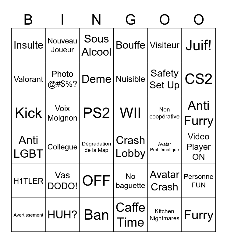This bingo card has 43 words: Furry, Kick, Véhicule, Dégradation de la Map, No baguette, Video Player ON, Sous Alcool, Voix KD, Visiteur, Crash Lobby, Bouffe, Voix Moignon, Anti Furry, Non coopérative, Ban, Avatar Problématique, Personne FUN, Safety Set Up, Soundboard, Nuisible, Nouveau Joueur, Avertissement, Avatar Crash, Insulte, Force Mute, PS2, Vas DODO!, Zappy be like, Anti LGBT, WII, Popcorn Time, Collegue, HUH?, CS2, OFF, Caffe Time, H1TLER, Photo @#$%?, Juif!, Deme, Kitchen Nightmares, Valorant and Hoppou.