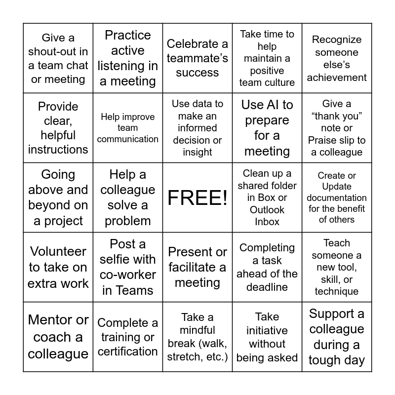 This bingo card has a free space and 24 words: Post a selfie with co-worker in Teams, Complete a training or certification, Use data to make an informed decision or insight, Mentor or coach a colleague, Recognize someone else’s achievement, Give a shout-out in a team chat or meeting, Provide clear, helpful instructions, Practice active listening in a meeting, Clean up a shared folder in Box or Outlook Inbox, Present or facilitate a meeting, Use AI to prepare for a meeting, Going above and beyond on a project, Completing a task ahead of the deadline, Teach someone a new tool, skill, or technique, Help improve team communication, Take initiative without being asked, Create or Update documentation for the benefit of others, Celebrate a teammate’s success, Give a “thank you” note or Praise slip to a colleague, Help a colleague solve a problem, Support a colleague during a tough day, Volunteer to take on extra work, Take time to help maintain a positive team culture and Take a mindful break (walk, stretch, etc.).