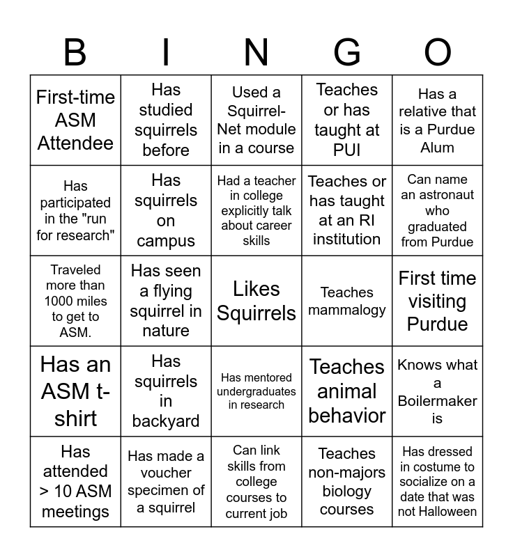 This bingo card has a free space and 24 words: Has attended > 10 ASM meetings, Has squirrels in backyard, Had a teacher in college explicitly talk about career skills, Teaches non-majors biology courses, Has a relative that is a Purdue Alum, First-time ASM Attendee, Has studied squirrels before, Used a Squirrel-Net module in a course, Teaches mammalogy, First time visiting Purdue, Traveled more than 1000 miles to get to ASM., Has squirrels on campus, Teaches animal behavior, Knows what a Boilermaker is, Has participated in the "run for research", Has made a voucher specimen of a squirrel, Can link skills from college courses to current job, Teaches or has taught at PUI, Can name an astronaut who graduated from Purdue, Has an ASM t-shirt, Has seen a flying squirrel in nature, Has mentored undergraduates in research, Teaches or has taught at an RI institution and Has dressed in costume to socialize on a date that was not Halloween.