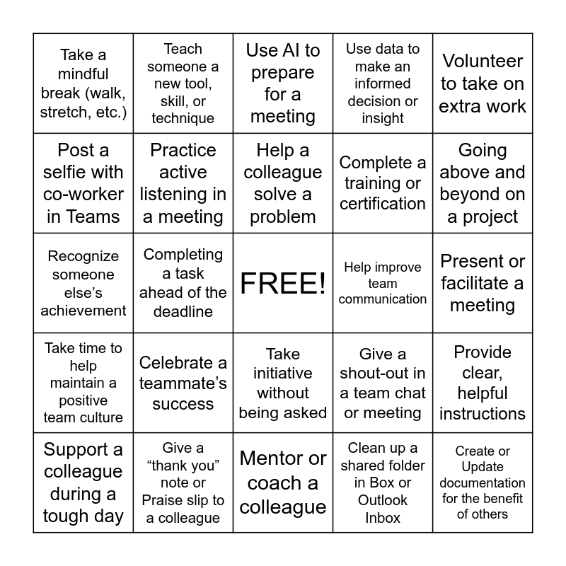 This bingo card has a free space and 24 words: Celebrate a teammate’s success, Give a “thank you” note or Praise slip to a colleague, Help a colleague solve a problem, Support a colleague during a tough day, Volunteer to take on extra work, Take a mindful break (walk, stretch, etc.), Post a selfie with co-worker in Teams, Teach someone a new tool, skill, or technique, Help improve team communication, Take initiative without being asked, Complete a training or certification, Recognize someone else’s achievement, Give a shout-out in a team chat or meeting, Provide clear, helpful instructions, Practice active listening in a meeting, Clean up a shared folder in Box or Outlook Inbox, Present or facilitate a meeting, Use AI to prepare for a meeting, Going above and beyond on a project, Completing a task ahead of the deadline, Create or Update documentation for the benefit of others, Take time to help maintain a positive team culture, Use data to make an informed decision or insight and Mentor or coach a colleague.