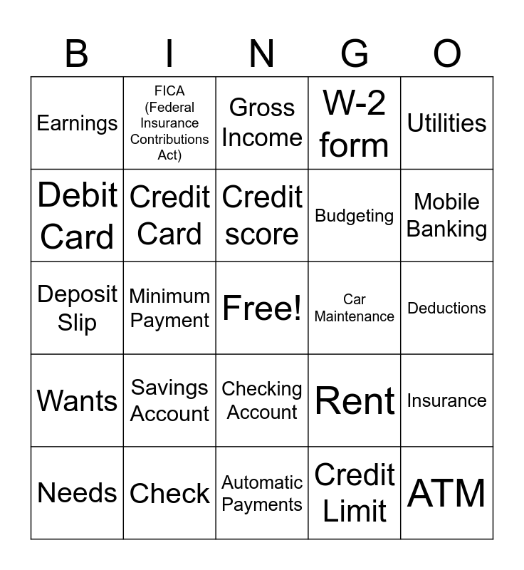 This bingo card has a free space and 29 words: Needs, Interest, Minimum Payment, Security Deposit, Earnings, Gross Income, Credit Card, Savings Account, Car Maintenance, Check, Deductions, ATM, Automatic Payments, Credit Limit, Mobile Banking, Social security, Checking Account, Wants, Utilities, Deposit Slip, Rent, Net Income, Budgeting, Debit Card, W-2 form, FICA (Federal Insurance Contributions Act), Insurance, Credit score and Annual Percentage Rate (APR).
