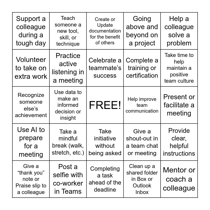 This bingo card has a free space and 24 words: Take a mindful break (walk, stretch, etc.), Post a selfie with co-worker in Teams, Celebrate a teammate’s success, Give a “thank you” note or Praise slip to a colleague, Help a colleague solve a problem, Support a colleague during a tough day, Volunteer to take on extra work, Teach someone a new tool, skill, or technique, Help improve team communication, Take initiative without being asked, Complete a training or certification, Recognize someone else’s achievement, Give a shout-out in a team chat or meeting, Provide clear, helpful instructions, Practice active listening in a meeting, Clean up a shared folder in Box or Outlook Inbox, Present or facilitate a meeting, Create or Update documentation for the benefit of others, Take time to help maintain a positive team culture, Use data to make an informed decision or insight, Mentor or coach a colleague, Use AI to prepare for a meeting, Going above and beyond on a project and Completing a task ahead of the deadline.