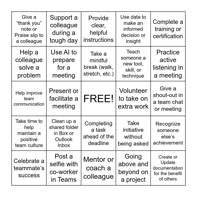 This bingo card has a free space and 24 words: Clean up a shared folder in Box or Outlook Inbox, Post a selfie with co-worker in Teams, Take a mindful break (walk, stretch, etc.), Celebrate a teammate’s success, Complete a training or certification, Give a “thank you” note or Praise slip to a colleague, Help a colleague solve a problem, Support a colleague during a tough day, Volunteer to take on extra work, Completing a task ahead of the deadline, Teach someone a new tool, skill, or technique, Help improve team communication, Take initiative without being asked, Recognize someone else’s achievement, Use AI to prepare for a meeting, Going above and beyond on a project, Give a shout-out in a team chat or meeting, Provide clear, helpful instructions, Practice active listening in a meeting, Present or facilitate a meeting, Create or Update documentation for the benefit of others, Take time to help maintain a positive team culture, Use data to make an informed decision or insight and Mentor or coach a colleague.