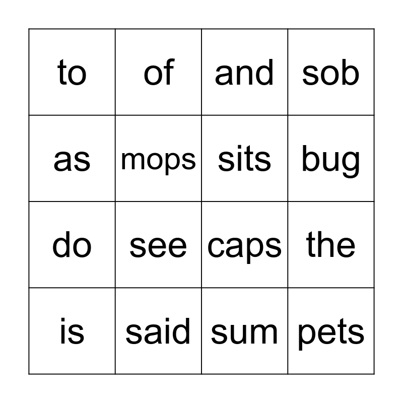 This bingo card has 20 words: the, I, and, a, is, as, said, to, do, of, see, caps, mops, pets, sits, naps, bug, sob, sum and ban.